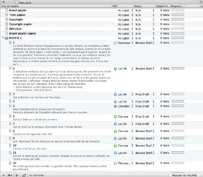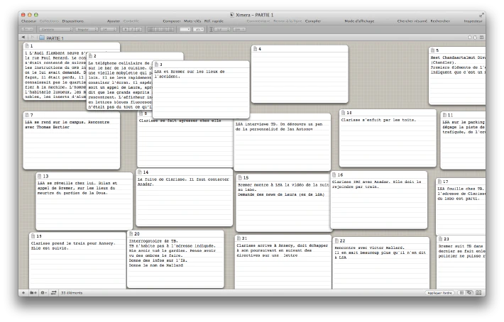 Quant à l’organisation : Scrivener est devenu mon fourre-tout de tout projet d’écriture. Tout est rassemblé en un seul endroit : le manuscrit, les scènes rejetées, les recherches, les fiches sur les personnages et sur les lieux, et en plus, on peut réorganiser tous les items comme on le souhaite, travailler sur la structure, en mode post-its sur tableau, en mode plan, sur le texte directement…