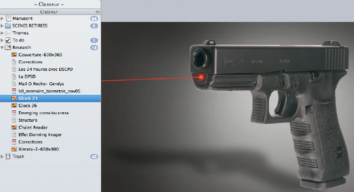 C’est probablement le point qui m’a convaincu le plus, en tout cas à mes débuts avec ce logiciel. Scrivener accepte tout type de documents, des liens, et vous pouvez créer des dossiers résumant les recherches que vous avez faites pour votre projet.