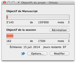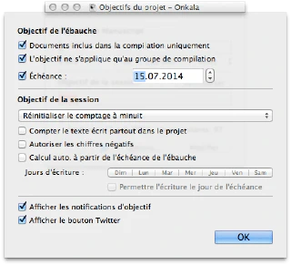Scrivener propose un outil d’objectif tout à fait adapté et réglable aux petits oignons. On peut rentrer un objectif journalier, un objectif pour l’ensemble du projet ainsi qu’une deadline. On peut même régler l’objectif journalier pour qu’il s’adapte automatiquement pour être certain de finir le projet en temps et en heure.