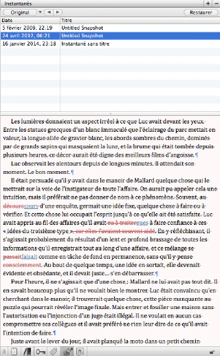Scrivener offre la possibilité de faire des instantanés de vos textes. Vous pouvez ainsi suivre les différentes modifications au fil des corrections et des différentes passes d’édition.