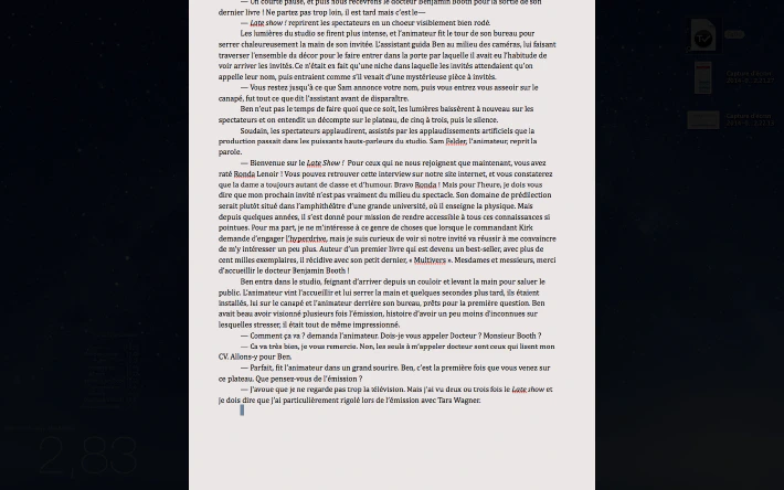 Je ne m’inquiète plus d’avoir sauvegardé mon texte, du niveau de ma batterie, ou d’un plantage du logiciel (encore que Scrivener n’a jamais planté une seule fois depuis que je l’utilise, toutes versions confondues).